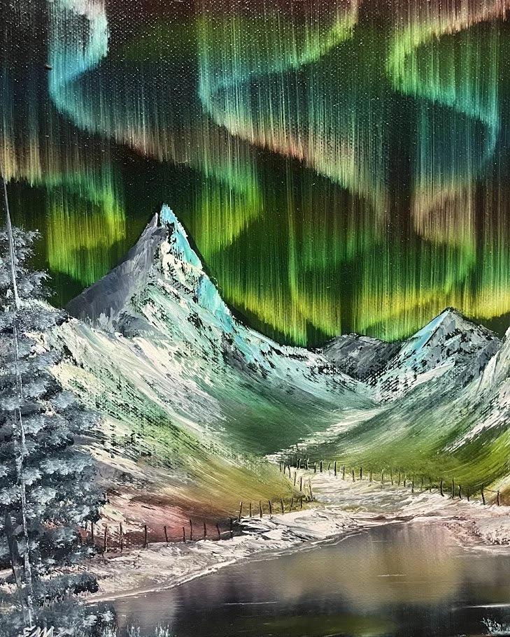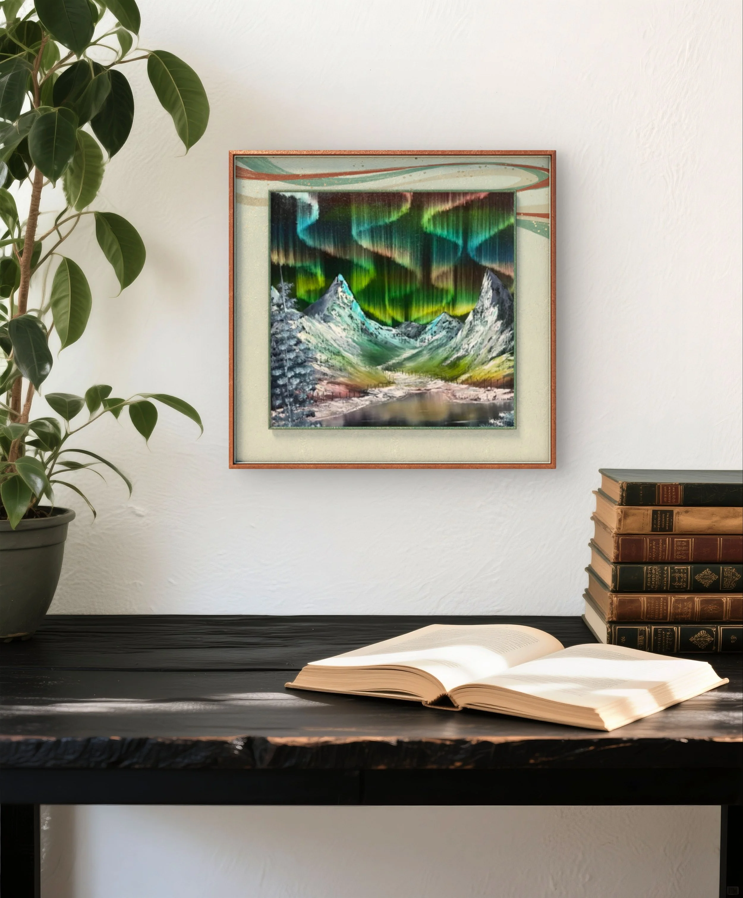A striking and artistic piece that merges two elements of nature—a peaceful sunset over a lake and the form of a bear —to create a captivating image of the raw, beautiful wilderness.
